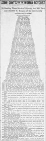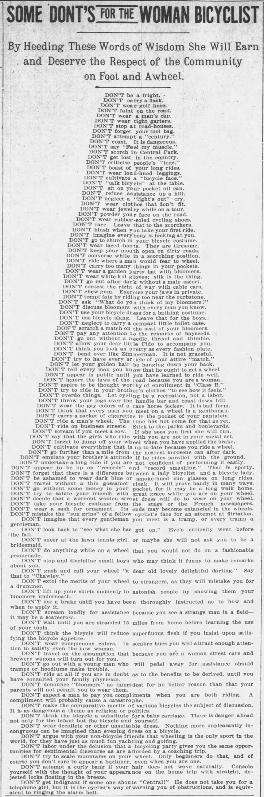 There's a series of late 1800s news articles I used to have talking about these issues, and the "rules for women on bicycles" such as allowing men to help push you up a hill, don't show off your bloomers to men, don't say "feel my muscle", don't ride in your brother's clothes to "see how it fits" women are so obsessed with wanting to be men, because we're cooling and better than them at everything and in charge and rule over them and they're little oppressed cute soft marshmallows born to bend over.