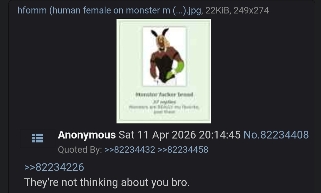 >>38545people have different tastes. i like monsters because they're a vessel to sexualise concepts that are otherwise taboo or unappealing in different contexts. lmao at imagining it's a psyop. you seriously think that there are scrotes conspiring to acclimate you to monster fucking? they aren't capable of high effort nor imagination. or is it that you're worried this thread was made to misrepresent women in general as animal fuckers or something adjacent? in that case i do understand your reaction. but a) op explained herself, and b) males will accuse and lie about us regardless, so i'm not interested in concealing my escapist fantasies because of their inability to separate reality from their media consumption.